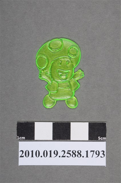 1.本物件為電玩超級瑪利歐兄弟(超級瑪利)之奇諾比奧尪仔仙。硬質塑膠材質,扁平,單一綠色,雙面浮雕圖案,兩面圖案相同。圖案為擬人化的香菇,頭戴香菇帽,帽上有圓斑,穿著背心,張嘴笑,雙手往上伸,呈雀躍貌。在新版電玩遊戲設計中,奇諾比奧是香菇王國皇室的人。