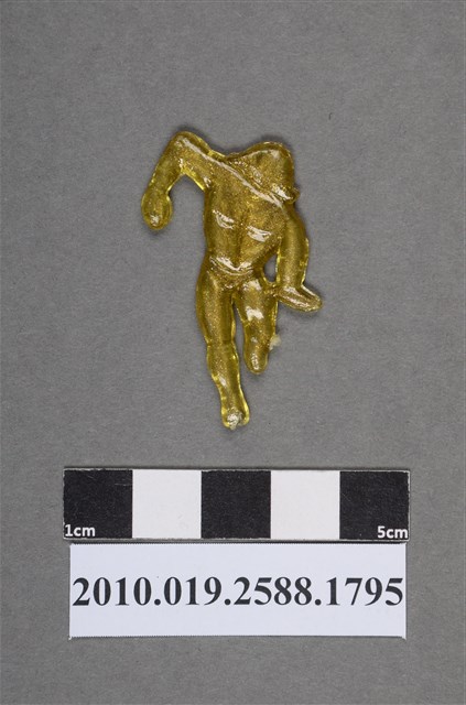1.本物件為伸手人型尪仔仙。硬質塑膠材質,扁平,單一金色,內嵌金粉,雙面浮雕圖案。正面圖案為彎腰跑步之人型,可見腿部肌肉線條,戴著頭盔,左手往後擺,右手往下伸,有抓取物品之貌。2.尪仔仙尺寸大致可分成小、中、大型,小型約長2-5公分,中型約長8-15公分,顏色以單色為主。有些大型的則可長達30公分左右,以菩薩、神仙和民間傳說故事人物等造型為主,塗上金銀紅黃彩漆等亮色。1960、70年代的尪仔仙多以民間傳說故事、歌仔戲、布袋戲人物為造型。1980年代改以卡通、電玩、漫畫人物造型為主。常見玩法之一為兩人(或多人)各持一只尪仔仙,輪流用手指彈射,看誰的尪仔仙先疊在對方上面,便可贏得對方用來對戰或是約定的尪仔仙。