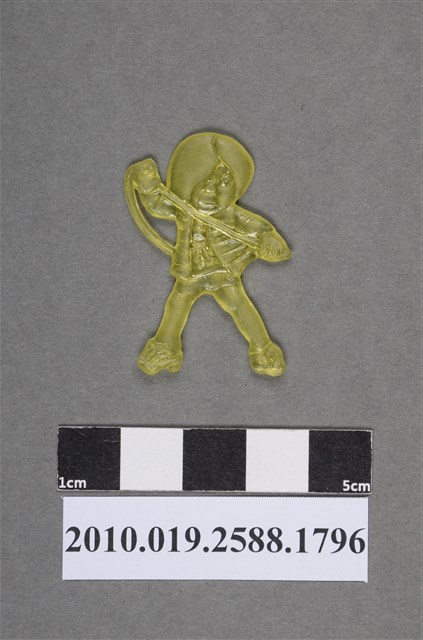 1.本物件為漫畫鬼太郎之鬼太郎尪仔仙。硬質塑膠材質,扁平,單一黃色,雙面浮雕圖案,兩面圖案相同。圖案為站立的鬼太郎,一邊頭髮蓋住眼睛,只露出1隻眼睛,穿著橫紋背心、短褲和日式木屐,雙手握住鞭子。