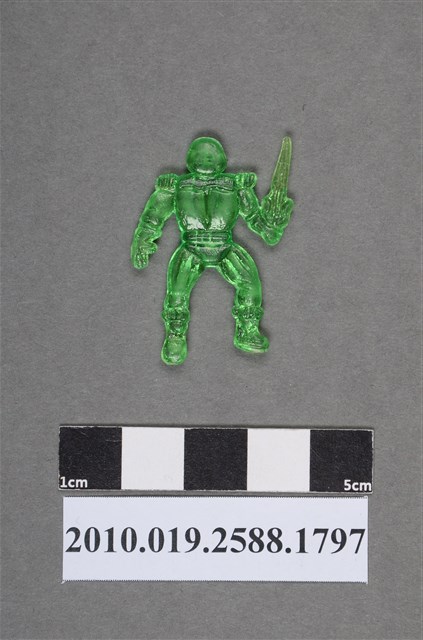 1.本物件為持劍人型尪仔仙。硬質塑膠材質,扁平,單一綠色,雙面浮雕圖案。正面圖案為戴有圓型頭罩的人型,裝扮是肩膀有凸出裝飾,繫有腰帶,腳穿靴子,另可見大腿肌肉線條,右手拿有劍型武器。2.尪仔仙尺寸大致可分成小、中、大型,小型約長2-5公分,中型約長8-15公分,顏色以單色為主。有些大型的則可長達30公分左右,以菩薩、神仙和民間傳說故事人物等造型為主,塗上金銀紅黃彩漆等亮色。1960、70年代的尪仔仙多以民間傳說故事、歌仔戲、布袋戲人物為造型。1980年代改以卡通、電玩、漫畫人物造型為主。常見玩法之一為兩人(或多人)各持一只尪仔仙,輪流用手指彈射,看誰的尪仔仙先疊在對方上面,便可贏得對方用來對戰或是約定的尪仔仙。