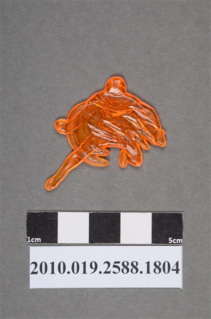 1.本物件為卡通科學小飛俠之鐵雄尪仔仙。硬質塑膠材質,扁平,單一橘色,雙面浮雕圖案。正面圖案為單腳蹲的鐵雄,戴著頭盔,左手伸直握拳,稍微撐開鳥羽狀披風,左腳伸直,右膝蓋彎曲。