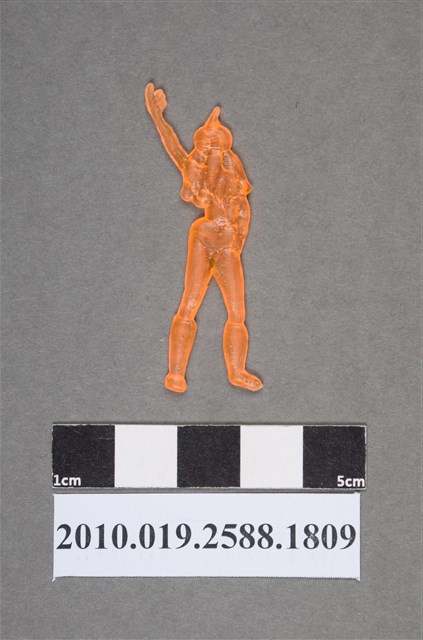 1.本物件為單手插腰人型尪仔仙。硬質塑膠材質,扁平,單一橘色,雙面浮雕圖案。正面圖案為站立人型,女性形象,戴著頭盔,頭盔正上方有角狀構件,有長髮和胸部,穿著靴子,一手往上伸直,一手插腰。2.尪仔仙尺寸大致可分成小、中、大型,小型約長2-5公分,中型約長8-15公分,顏色以單色為主。有些大型的則可長達30公分左右,以菩薩、神仙和民間傳說故事人物等造型為主,塗上金銀紅黃彩漆等亮色。1960、70年代的尪仔仙多以民間傳說故事、歌仔戲、布袋戲人物為造型。1980年代改以卡通、電玩、漫畫人物造型為主。常見玩法之一為兩人(或多人)各持一只尪仔仙,輪流用手指彈射,看誰的尪仔仙先疊在對方上面,便可贏得對方用來對戰或是約定的尪仔仙。