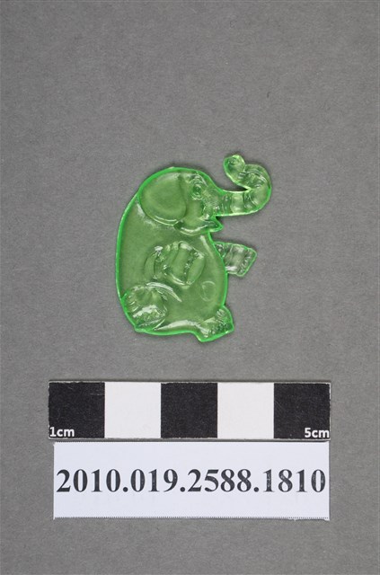 1.本物件為大象尪仔仙。硬質塑膠材質,扁平,單一綠色,雙面浮雕圖案,兩面圖案相同。圖案為站立的大象,大象象鼻彎曲舉起,單隻腳著地,另一腳抬起。2.尪仔仙尺寸大致可分成小、中、大型,小型約長2-5公分,中型約長8-15公分,顏色以單色為主。有些大型的則可長達30公分左右,以菩薩、神仙和民間傳說故事人物等造型為主,塗上金銀紅黃彩漆等亮色。1960、70年代的尪仔仙多以民間傳說故事、歌仔戲、布袋戲人物為造型。1980年代改以卡通、電玩、漫畫人物造型為主。常見玩法之一為兩人(或多人)各持一只尪仔仙,輪流用手指彈射,看誰的尪仔仙先疊在對方上面,便可贏得對方用來對戰或是約定的尪仔仙。