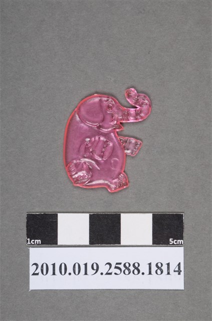 1.本物件為大象尪仔仙。硬質塑膠材質,扁平,單一粉紅色,雙面浮雕圖案,兩面圖案相同。圖案為站立的大象,大象象鼻彎曲舉起,單隻腳著地,另一腳抬起。