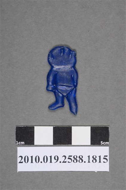 1.本物件為藍色人型尪仔仙。硬質塑膠材質,扁平,單一藍色,雙面浮雕圖案。正面圖案為站立男性人型,人型整體比例為矮胖身形,其有大耳,長有鬍子,肚子微凸,雙手自然垂下。2.尪仔仙尺寸大致可分成小、中、大型,小型約長2-5公分,中型約長8-15公分,顏色以單色為主。有些大型的則可長達30公分左右,以菩薩、神仙和民間傳說故事人物等造型為主,塗上金銀紅黃彩漆等亮色。1960、70年代的尪仔仙多以民間傳說故事、歌仔戲、布袋戲人物為造型。1980年代改以卡通、電玩、漫畫人物造型為主。常見玩法之一為兩人(或多人)各持一只尪仔仙,輪流用手指彈射,看誰的尪仔仙先疊在對方上面,便可贏得對方用來對戰或是約定的尪仔仙。