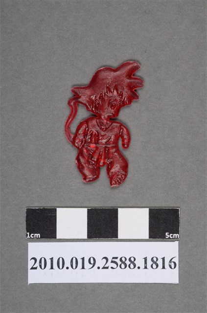 1.本物件為漫畫七龍珠之孫悟空尪仔仙。硬質塑膠材質,扁平,單一紅色,雙面浮雕圖案,兩面圖案相同。從髮型和尾巴可以判斷出此圖案為小時候的孫悟空,頭往側邊看,其服裝為功夫服,腰間綁有繫帶,尾巴翹高,呈走路姿勢。
