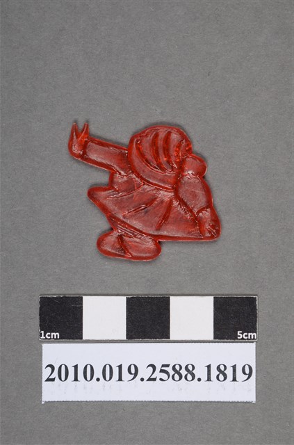 1.本物件為頭巾人型尪仔仙。硬質塑膠材質,扁平,單一紅色,雙面浮雕圖案。正面圖案為奔跑的人型,頭部綁了頭巾,蒙住頭頂和臉頰,鼻子比例大呈橢圓形。其左手向後伸展,衣服有飛揚感,右腳伸直,左腳向後彎,呈快速奔跑之貌。2.尪仔仙尺寸大致可分成小、中、大型,小型約長2-5公分,中型約長8-15公分,顏色以單色為主。有些大型的則可長達30公分左右,以菩薩、神仙和民間傳說故事人物等造型為主,塗上金銀紅黃彩漆等亮色。1960、70年代的尪仔仙多以民間傳說故事、歌仔戲、布袋戲人物為造型。1980年代改以卡通、電玩、漫畫人物造型為主。常見玩法之一為兩人(或多人)各持一只尪仔仙,輪流用手指彈射,看誰的尪仔仙先疊在對方上面,便可贏得對方用來對戰或是約定的尪仔仙。