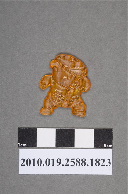 1.本物件為漫畫七龍珠之烏龍尪仔仙。硬質塑膠材質,扁平,單一橙色,雙面浮雕圖案,兩面圖案相同。圖案為站立的小豬,戴著帽子,穿著中間有排扣的衣服,身體往前傾。2.七龍珠是日本漫畫家鳥山明的作品,格鬥冒險漫畫,西元1986年卡通動畫面世,最重要的主角是孫悟空。漫畫延伸出動畫、電影和電玩遊戲等產品,風靡全世界。3.尪仔仙尺寸大致可分成小、中、大型,小型約長2-5公分,中型約長8-15公分,顏色以單色為主。有些大型的則可長達30公分左右,以菩薩、神仙和民間傳說故事人物等造型為主,塗上金銀紅黃彩漆等亮色。1960、70年代的尪仔仙多以民間傳說故事、歌仔戲、布袋戲人物為造型。1980年代改以卡通、電玩、漫畫人物造型為主。常見玩法之一為兩人(或多人)各持一只尪仔仙,輪流用手指彈射,看誰的尪仔仙先疊在對方上面,便可贏得對方用來對戰或是約定的尪仔仙。