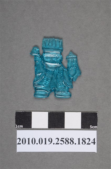 1.本物件為道士尪仔仙。硬質塑膠材質,扁平,單一藍色,雙面浮雕圖案。正面圖案為站立的道士,其頭戴斜頂道冠,戴眼鏡,身穿道袍並繫有領帶,左手拿搖鈴,右手拿幡旗。2.尪仔仙尺寸大致可分成小、中、大型,小型約長2-5公分,中型約長8-15公分,顏色以單色為主。有些大型的則可長達30公分左右,以菩薩、神仙和民間傳說故事人物等造型為主,塗上金銀紅黃彩漆等亮色。1960、70年代的尪仔仙多以民間傳說故事、歌仔戲、布袋戲人物為造型。1980年代改以卡通、電玩、漫畫人物造型為主。常見玩法之一為兩人(或多人)各持一只尪仔仙,輪流用手指彈射,看誰的尪仔仙先疊在對方上面,便可贏得對方用來對戰或是約定的尪仔仙。