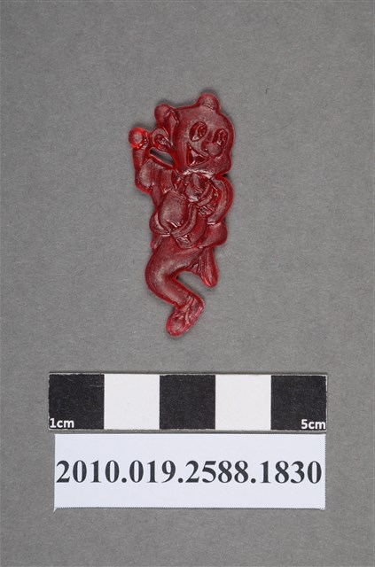 1.本物件為紅色人型尪仔仙。硬質塑膠材質,扁平,單一紅色,雙面浮雕圖案,兩面圖案相同。圖案為頭上綁著2個髮髻的人型,張嘴笑,面容愉快,一手拉著1包物品,另一手高舉,一腳離地抬起,另一腳尖著地。2.尪仔仙尺寸大致可分成小、中、大型,小型約長2-5公分,中型約長8-15公分,顏色以單色為主。有些大型的則可長達30公分左右,以菩薩、神仙和民間傳說故事人物等造型為主,塗上金銀紅黃彩漆等亮色。1960、70年代的尪仔仙多以民間傳說故事、歌仔戲、布袋戲人物為造型。1980年代改以卡通、電玩、漫畫人物造型為主。常見玩法之一為兩人(或多人)各持一只尪仔仙,輪流用手指彈射,看誰的尪仔仙先疊在對方上面,便可贏得對方用來對戰或是約定的尪仔仙。