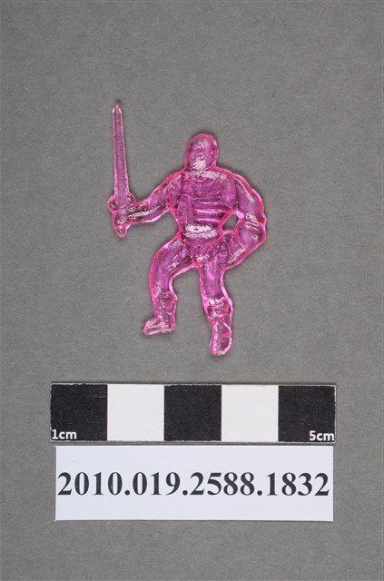 1.本物件為持劍人型尪仔仙。硬質塑膠材質,扁平,單一粉紅色,雙面浮雕圖案。正面圖案為站立的男性人型,可見其手臂和大腿的肌肉線條,穿有靴子,左手拿著劍型武器,右手握拳。2.尪仔仙尺寸大致可分成小、中、大型,小型約長2-5公分,中型約長8-15公分,顏色以單色為主。有些大型的則可長達30公分左右,以菩薩、神仙和民間傳說故事人物等造型為主,塗上金銀紅黃彩漆等亮色。1960、70年代的尪仔仙多以民間傳說故事、歌仔戲、布袋戲人物為造型。1980年代改以卡通、電玩、漫畫人物造型為主。常見玩法之一為兩人(或多人)各持一只尪仔仙,輪流用手指彈射,看誰的尪仔仙先疊在對方上面,便可贏得對方用來對戰或是約定的尪仔仙。