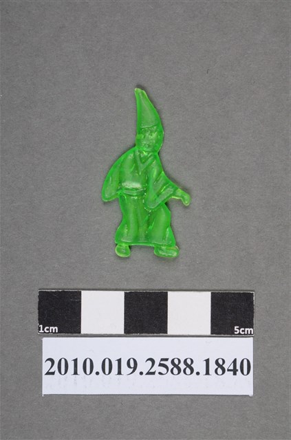 1.本物件為戴帽人型尪仔仙。硬質塑膠材質,扁平,單一綠色,雙面浮雕圖案。正面圖案為站立人型,其戴著尖型高帽子,身穿長袍,袍長及腳,寬袖,中間有腰帶,身體往後彎腰,雙手微微抬起。2.尪仔仙尺寸大致可分成小、中、大型,小型約長2-5公分,中型約長8-15公分,顏色以單色為主。有些大型的則可長達30公分左右,以菩薩、神仙和民間傳說故事人物等造型為主,塗上金銀紅黃彩漆等亮色。1960、70年代的尪仔仙多以民間傳說故事、歌仔戲、布袋戲人物為造型。1980年代改以卡通、電玩、漫畫人物造型為主。常見玩法之一為兩人(或多人)各持一只尪仔仙,輪流用手指彈射,看誰的尪仔仙先疊在對方上面,便可贏得對方用來對戰或是約定的尪仔仙。