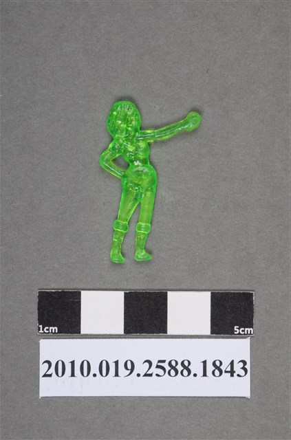 1.本物件為單手插腰人型尪仔仙。硬質塑膠材質,扁平,單一綠色,雙面浮雕圖案。正面圖案為站立的女性人型,髮長及肩,穿有靴子,左手插腰,右手握拳往前伸。2.尪仔仙尺寸大致可分成小、中、大型,小型約長2-5公分,中型約長8-15公分,顏色以單色為主。有些大型的則可長達30公分左右,以菩薩、神仙和民間傳說故事人物等造型為主,塗上金銀紅黃彩漆等亮色。1960、70年代的尪仔仙多以民間傳說故事、歌仔戲、布袋戲人物為造型。1980年代改以卡通、電玩、漫畫人物造型為主。常見玩法之一為兩人(或多人)各持一只尪仔仙,輪流用手指彈射,看誰的尪仔仙先疊在對方上面,便可贏得對方用來對戰或是約定的尪仔仙。