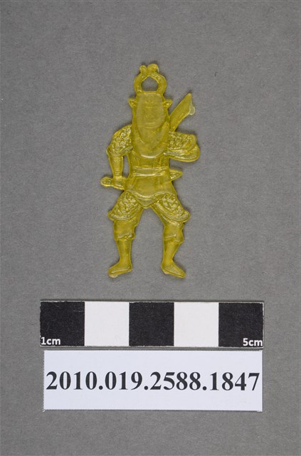 1.本物件為持雙刀人型尪仔仙。硬質塑膠材質,扁平,單一黃色,雙面浮雕圖案。正面圖案為牛頭人身,頭頂有彎曲牛角,身穿盔甲,雙手拿刀。2.尪仔仙尺寸大致可分成小、中、大型,小型約長2-5公分,中型約長8-15公分,顏色以單色為主。有些大型的則可長達30公分左右,以菩薩、神仙和民間傳說故事人物等造型為主,塗上金銀紅黃彩漆等亮色。1960、70年代的尪仔仙多以民間傳說故事、歌仔戲、布袋戲人物為造型。1980年代改以卡通、電玩、漫畫人物造型為主。常見玩法之一為兩人(或多人)各持一只尪仔仙,輪流用手指彈射,看誰的尪仔仙先疊在對方上面,便可贏得對方用來對戰或是約定的尪仔仙。