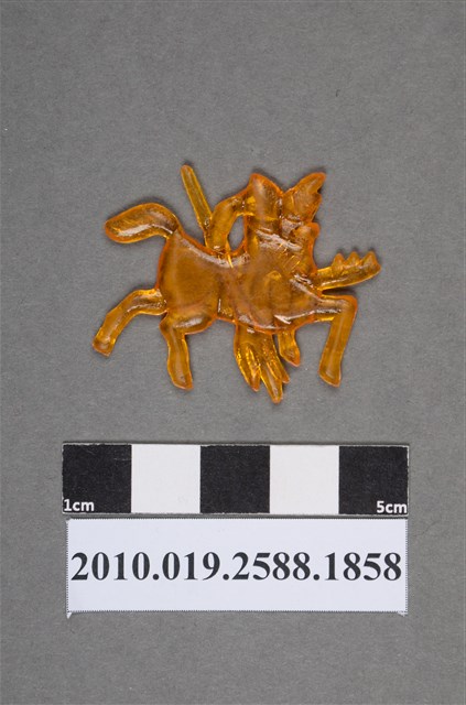 1.本物件為持三叉戟人型尪仔仙。硬質塑膠材質,扁平,單一橙色,雙面浮雕圖案。正面圖案似為人與動物的纏鬥,人物手上拿著三叉戟,動物有4隻腳和尾巴,無法判斷為何種動物。2.尪仔仙尺寸大致可分成小、中、大型,小型約長2-5公分,中型約長8-15公分,顏色以單色為主。有些大型的則可長達30公分左右,以菩薩、神仙和民間傳說故事人物等造型為主,塗上金銀紅黃彩漆等亮色。1960、70年代的尪仔仙多以民間傳說故事、歌仔戲、布袋戲人物為造型。1980年代改以卡通、電玩、漫畫人物造型為主。常見玩法之一為兩人(或多人)各持一只尪仔仙,輪流用手指彈射,看誰的尪仔仙先疊在對方上面,便可贏得對方用來對戰或是約定的尪仔仙。