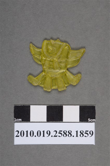 1.本物件為頭盔頭像尪仔仙。硬質塑膠材質,扁平,單一黃色,雙面浮雕圖案,兩面圖案相同。圖案為戴著面具型頭盔遮住全頭部,頭頂有凸角裝飾,脖子上有放射狀裝飾之頭像。2.尪仔仙尺寸大致可分成小、中、大型,小型約長2-5公分,中型約長8-15公分,顏色以單色為主。有些大型的則可長達30公分左右,以菩薩、神仙和民間傳說故事人物等造型為主,塗上金銀紅黃彩漆等亮色。1960、70年代的尪仔仙多以民間傳說故事、歌仔戲、布袋戲人物為造型。1980年代改以卡通、電玩、漫畫人物造型為主。常見玩法之一為兩人(或多人)各持一只尪仔仙,輪流用手指彈射,看誰的尪仔仙先疊在對方上面,便可贏得對方用來對戰或是約定的尪仔仙。