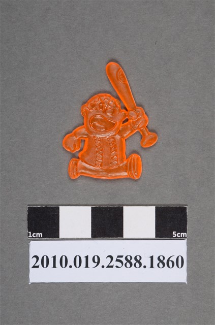 1.本物件為卡通哆啦A夢(小叮噹)之胖虎尪仔仙。硬質塑膠材質,扁平,單一橘色,雙面浮雕圖案,兩面圖案相同。圖案為生氣的胖虎,臉部表情生氣,嘴巴張大,上衣有2條直條紋。其一手握著棒球棒,另一手握拳,雙腳幾乎呈直線狀,呈走路速度快之感。