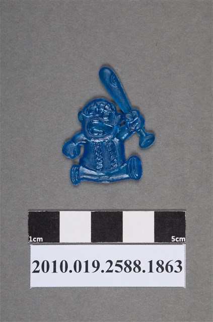 1.本物件為卡通哆啦A夢(小叮噹)之胖虎尪仔仙。硬質塑膠材質,扁平,單一藍色,雙面浮雕圖案,兩面圖案相同。圖案為生氣的胖虎,臉部表情生氣,嘴巴張大,上衣有2條直條紋。其一手握著棒球棒,另一手握拳,雙腳幾乎呈直線狀,呈走路速度快之感。
