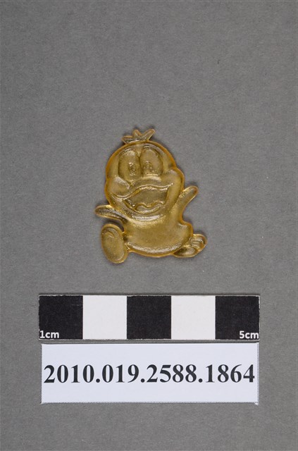 1.本物件為黃色雞型尪仔仙。硬質塑膠材質,扁平,單一黃色,雙面浮雕圖案,兩面圖案相同。圖案為擬人化小雞,頭頂有3根毛,嘴巴張開,眼睛有滴淚,翅膀往左右邊張開,呈走路貌。2.尪仔仙尺寸大致可分成小、中、大型,小型約長2-5公分,中型約長8-15公分,顏色以單色為主。有些大型的則可長達30公分左右,以菩薩、神仙和民間傳說故事人物等造型為主,塗上金銀紅黃彩漆等亮色。1960、70年代的尪仔仙多以民間傳說故事、歌仔戲、布袋戲人物為造型。1980年代改以卡通、電玩、漫畫人物造型為主。常見玩法之一為兩人(或多人)各持一只尪仔仙,輪流用手指彈射,看誰的尪仔仙先疊在對方上面,便可贏得對方用來對戰或是約定的尪仔仙。