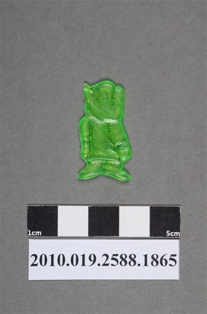 1.本物件為綠色人型尪仔仙。硬質塑膠材質,扁平,單一綠色,雙面浮雕圖案。正面圖案為站立人型,其頭部與身體長度比例相同,有尖形耳朵,雙手自然垂放,雙腳相併而站。2.尪仔仙尺寸大致可分成小、中、大型,小型約長2-5公分,中型約長8-15公分,顏色以單色為主。有些大型的則可長達30公分左右,以菩薩、神仙和民間傳說故事人物等造型為主,塗上金銀紅黃彩漆等亮色。1960、70年代的尪仔仙多以民間傳說故事、歌仔戲、布袋戲人物為造型。1980年代改以卡通、電玩、漫畫人物造型為主。常見玩法之一為兩人(或多人)各持一只尪仔仙,輪流用手指彈射,看誰的尪仔仙先疊在對方上面,便可贏得對方用來對戰或是約定的尪仔仙。