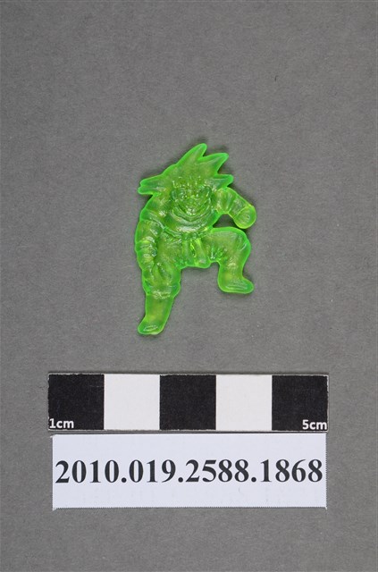 1.本物件為漫畫七龍珠之孫悟空尪仔仙。硬質塑膠材質,扁平,單一綠色,雙面浮雕圖案,兩面圖案相同。圖案為呈戰鬥姿勢的孫悟空,腰間繫有繫帶,彎腰向前傾,雙手握拳,雙腳微彎。