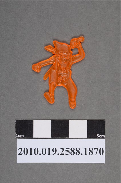 1.本物件為持劍人型尪仔仙。硬質塑膠材質,扁平,單一橘色,雙面浮雕圖案,兩面圖案相同。圖案為跳躍起來的男性,其髮型偏向一側,戴有護目鏡,穿著夾腳拖鞋。其一手抓著長劍要由背後往前揮,另一手握拳,一腳往後蹬,另一腳膝蓋向前彎曲。2.尪仔仙尺寸大致可分成小、中、大型,小型約長2-5公分,中型約長8-15公分,顏色以單色為主。有些大型的則可長達30公分左右,以菩薩、神仙和民間傳說故事人物等造型為主,塗上金銀紅黃彩漆等亮色。1960、70年代的尪仔仙多以民間傳說故事、歌仔戲、布袋戲人物為造型。1980年代改以卡通、電玩、漫畫人物造型為主。常見玩法之一為兩人(或多人)各持一只尪仔仙,輪流用手指彈射,看誰的尪仔仙先疊在對方上面,便可贏得對方用來對戰或是約定的尪仔仙。