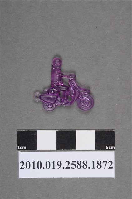1.本物件為摩托車騎士尪仔仙。硬質塑膠材質,扁平,單一紫色,雙面浮雕圖案,兩面圖案相同。圖案為其騎士騎乘摩托車,騎士戴有安全帽,雙手握住龍頭把手,摩托車類型接近偉士牌系列。尪仔仙有吊環。2.尪仔仙尺寸大致可分成小、中、大型,小型約長2-5公分,中型約長8-15公分,顏色以單色為主。有些大型的則可長達30公分左右,以菩薩、神仙和民間傳說故事人物等造型為主,塗上金銀紅黃彩漆等亮色。1960、70年代的尪仔仙多以民間傳說故事、歌仔戲、布袋戲人物為造型。1980年代改以卡通、電玩、漫畫人物造型為主。常見玩法之一為兩人(或多人)各持一只尪仔仙,輪流用手指彈射,看誰的尪仔仙先疊在對方上面,便可贏得對方用來對戰或是約定的尪仔仙。