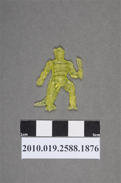 1.本物件為持劍人型尪仔仙。硬質塑膠材質,扁平,單一黃色,雙面浮雕圖案,兩面圖案相同。圖案為站立獸人,頭戴面具型頭盔遮住全頭部,上半身有一截截的紋路,右手拿短劍,有1條粗尾巴。短劍劍身略有破損。2.尪仔仙尺寸大致可分成小、中、大型,小型約長2-5公分,中型約長8-15公分,顏色以單色為主。有些大型的則可長達30公分左右,以菩薩、神仙和民間傳說故事人物等造型為主,塗上金銀紅黃彩漆等亮色。1960、70年代的尪仔仙多以民間傳說故事、歌仔戲、布袋戲人物為造型。1980年代改以卡通、電玩、漫畫人物造型為主。常見玩法之一為兩人(或多人)各持一只尪仔仙,輪流用手指彈射,看誰的尪仔仙先疊在對方上面,便可贏得對方用來對戰或是約定的尪仔仙。