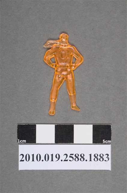 1.本物件為超人尪仔仙。硬質塑膠材質,扁平,單一橘色,雙面浮雕圖案。正面圖案為超人穿著披風和超人裝,胸前有S字,披風揚起,雙手插腰。
