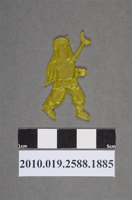 1.本物件為沙悟淨尪仔仙。硬質塑膠材質,扁平,單一黃色,雙面浮雕圖案。正面圖案為走路的沙悟淨,頭上戴著彎月形的頭箍,長有鬍子,左手握有棍狀武器,頂端有彎月形裝飾。沙悟淨為西遊記之角色。