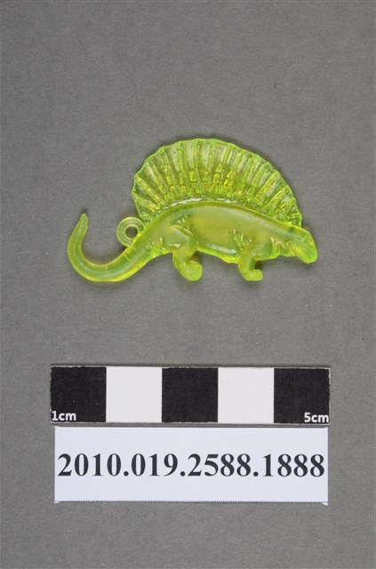 1.本物件為黃色爬蟲類尪仔仙。硬質塑膠材質,扁平,單一黃色,雙面浮雕圖案,兩面圖案相同。圖案為爬蟲類動物,有棘背和長尾巴,腳部著地。尪仔仙有吊環。2.尪仔仙尺寸大致可分成小、中、大型,小型約長2-5公分,中型約長8-15公分,顏色以單色為主。有些大型的則可長達30公分左右,以菩薩、神仙和民間傳說故事人物等造型為主,塗上金銀紅黃彩漆等亮色。1960、70年代的尪仔仙多以民間傳說故事、歌仔戲、布袋戲人物為造型。1980年代改以卡通、電玩、漫畫人物造型為主。常見玩法之一為兩人(或多人)各持一只尪仔仙,輪流用手指彈射,看誰的尪仔仙先疊在對方上面,便可贏得對方用來對戰或是約定的尪仔仙。