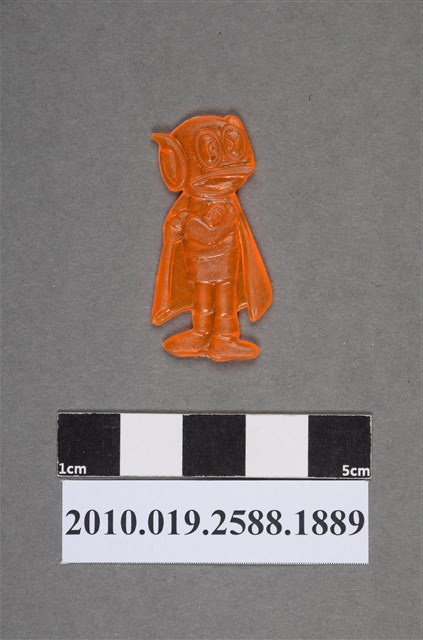 1.本物件為漫畫小超人帕門之小超人帕門尪仔仙。硬質塑膠材質,扁平,單一橘色,雙面浮雕圖案,兩面圖案相同。圖案為男孩頭戴頭盔,身穿披風,雙手交叉於胸前之人型。