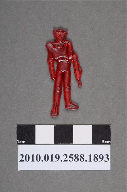 1.本物件為持武器人型尪仔仙。硬質塑膠材質,扁平,單一紅色,雙面浮雕圖案。正面圖案為站立人型,全身都有裝備,有面罩型頭盔、護肘、手套、靴子等,胸前有閃電符號,左手握拳,右手與某種武器合為一體。2.尪仔仙尺寸大致可分成小、中、大型,小型約長2-5公分,中型約長8-15公分,顏色以單色為主。有些大型的則可長達30公分左右,以菩薩、神仙和民間傳說故事人物等造型為主,塗上金銀紅黃彩漆等亮色。1960、70年代的尪仔仙多以民間傳說故事、歌仔戲、布袋戲人物為造型。1980年代改以卡通、電玩、漫畫人物造型為主。常見玩法之一為兩人(或多人)各持一只尪仔仙,輪流用手指彈射,看誰的尪仔仙先疊在對方上面,便可贏得對方用來對戰或是約定的尪仔仙。