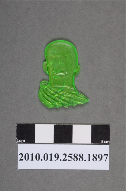 1.本物件為頭盔頭像尪仔仙。硬質塑膠材質,扁平,單一綠色,雙面浮雕圖案。正面圖案為戴著頭盔的人型頭像,頭盔正中間有菱形,耳朵在頭盔外,眼角下垂,長下巴,下巴底下有一部分服裝裝飾。2.尪仔仙尺寸大致可分成小、中、大型,小型約長2-5公分,中型約長8-15公分,顏色以單色為主。有些大型的則可長達30公分左右,以菩薩、神仙和民間傳說故事人物等造型為主,塗上金銀紅黃彩漆等亮色。1960、70年代的尪仔仙多以民間傳說故事、歌仔戲、布袋戲人物為造型。1980年代改以卡通、電玩、漫畫人物造型為主。常見玩法之一為兩人(或多人)各持一只尪仔仙,輪流用手指彈射,看誰的尪仔仙先疊在對方上面,便可贏得對方用來對戰或是約定的尪仔仙。