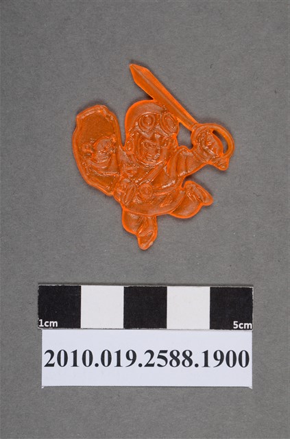 1.本物件為持劍盾人型尪仔仙。硬質塑膠材質,扁平,單一橘色,雙面浮雕圖案,兩面圖案相同。圖案為戰鬥的人型,其頭戴安全帽,安全帽上有飛行眼鏡,身穿大外套,斜揹某物,一手拿盾牌,一手舉著長劍,雙腳有跳躍貌。