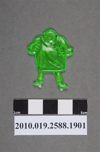 1.本物件為綠色人型尪仔仙。硬質塑膠材質,扁平,單一綠色,雙面浮雕圖案。正面圖案為站立人型,其頭小身體大腳細,身穿大外套,大外套有4個扣子,雙手舉起至胸前。
