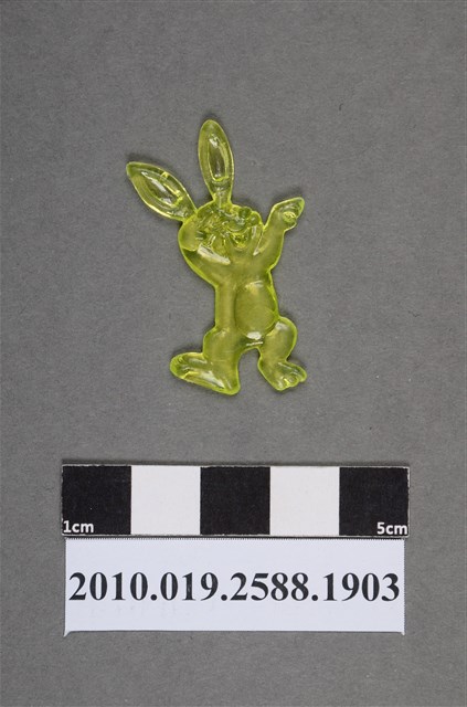 1.本物件為跳舞兔型尪仔仙。硬質塑膠材質,扁平,單一黃色,雙面浮雕圖案,兩面圖案相同。圖案為擬人化的兔子,耳朵高聳,張嘴,雙手舉起至頭,為站姿,一腳腳後跟抵地,呈跳舞之姿。
