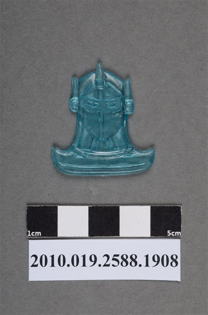1.本物件為頭盔頭像尪仔仙。硬質塑膠材質,扁平,單一藍色,雙面浮雕圖案。正面圖案為戴面具型頭盔遮住全頭部,頭頂和耳朵上有尖角裝飾,頭盔造型延伸至脖子之頭像。