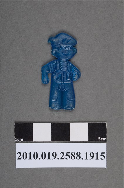 1.本物件為卡通淘氣阿丹之阿丹尪仔仙。硬質塑膠材質,扁平,單一不透明藍色,雙面浮雕圖案,兩面圖案相同。圖案為站立的阿丹,穿著吊帶褲和橫條紋上衣,一手在前,一手在後。尪仔仙表面略有磨損。