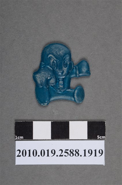 1.本物件為拳擊人型尪仔仙。硬質塑膠材質,扁平,單一不透明藍色,雙面浮雕圖案,兩面圖案相同。圖案為光頭男生,眉毛明顯,呈坐姿,雙手握拳,有一拳往前擊。