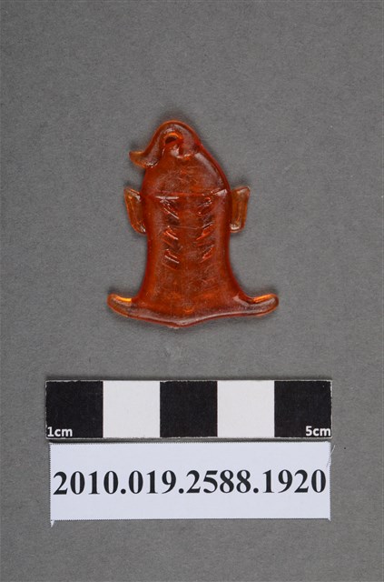 1.本物件為頭盔頭像尪仔仙。硬質塑膠材質,扁平,單一橙色,雙面浮雕圖案。正面圖案為戴面具型頭盔遮住全頭部,頭盔造型延伸至脖子,頭盔頂上有一截物品,眼睛底下有6條斜紋之頭像。