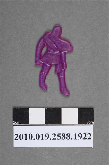 1.本物件為紫色人型尪仔仙。硬質塑膠材質,扁平,單一紫色,雙面浮雕圖案。正面圖案為站立人型,其留有長髮,隨風飄向一邊,穿有外套,長及臀部,有波浪裝飾,雙手無特殊姿勢,雙腳一前一後站著。