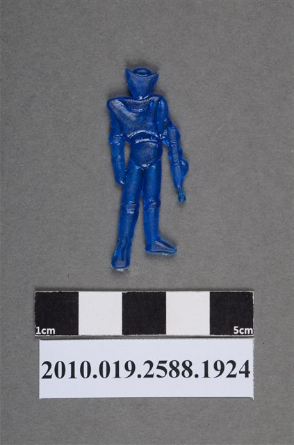 1.本物件為持武器人型尪仔仙。硬質塑膠材質,扁平,單一藍色,雙面浮雕圖案。正面圖案為站立人型,全身都有裝備,有面罩型頭盔、護肘、手套、靴子等,胸前有閃電符號,左手握拳,右手與某種武器合為一體。