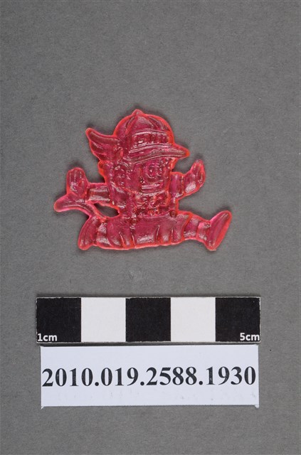 1.本物件為漫畫七龍珠之孫悟空尪仔仙。硬質塑膠材質,扁平,單一粉紅色,雙面浮雕圖案,兩面圖案相同。圖案為跑步的小孩,其頭上戴著1頂有翅膀裝飾的帽子,穿著吊帶褲,有尾巴,雙手往兩邊伸,雙腳幾乎呈水平打開,呈現跑或走很快之貌。此尪仔仙應為漫畫七龍珠之孫悟空打扮成漫畫怪博士與機器娃娃之阿拉蕾。