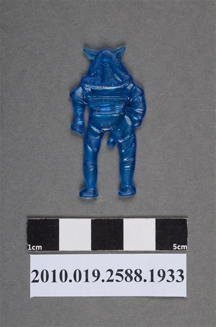 1.本物件為藍色機器人型尪仔仙。硬質塑膠材質,扁平,單一藍色,雙面浮雕圖案。正面圖案為機器人型,頭部呈鈍角形,頭頂有2個彎月形角,腰部有腰帶裝飾,左手手掌部分呈錐狀,右手有槍型武器。