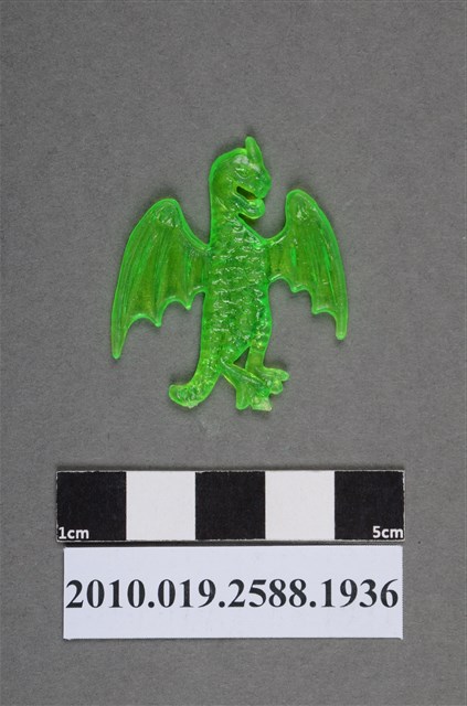 1.本物件為張翅恐龍型尪仔仙。硬質塑膠材質,扁平,單一綠色,雙面浮雕圖案,兩面圖案相同。圖案為站立的恐龍,其用爪狀雙腳站立,頭頂有角,嘴巴張開,雙翅張開,身上有鱗片和尾巴。