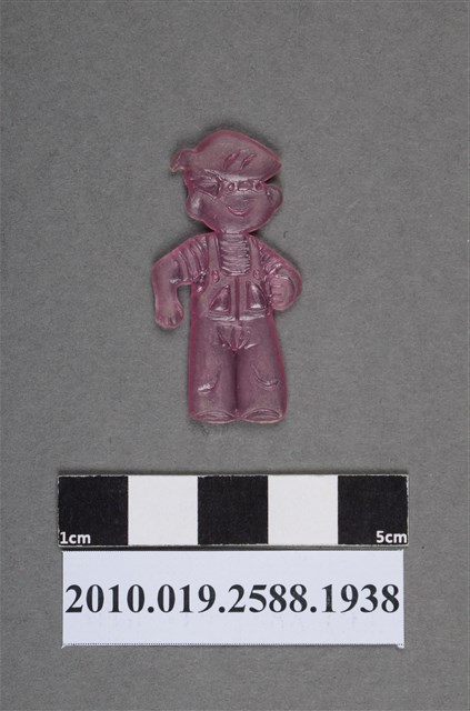 1.本物件為卡通淘氣阿丹之阿丹尪仔仙。硬質塑膠材質,扁平,單一紫色,雙面浮雕圖案,兩面圖案相同。圖案為站立的阿丹,穿著吊帶褲和橫條紋上衣,一手在前,一手在後。