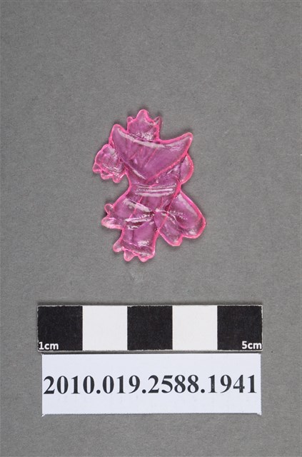 1.本物件為粉紅色機器人型尪仔仙。硬質塑膠材質,扁平,單一粉紅色,雙面浮雕圖案。正面圖案為獸面機器人型,臉部有尖嘴,胸前有大V字型裝飾,一手握拳,一手撐住地上,呈蹲姿。