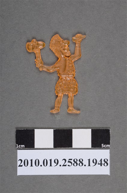 1.本物件為持槌人型尪仔仙。硬質塑膠材質,扁平,單一紅色,雙面浮雕圖案,兩面圖案相同。圖案為工作的原始人,男性,留有絡腮鬍,身穿獸皮紋的衣服,露出半邊肩膀和胸膛,無穿鞋,一手拿著石錘,一手舉著錐形釘。