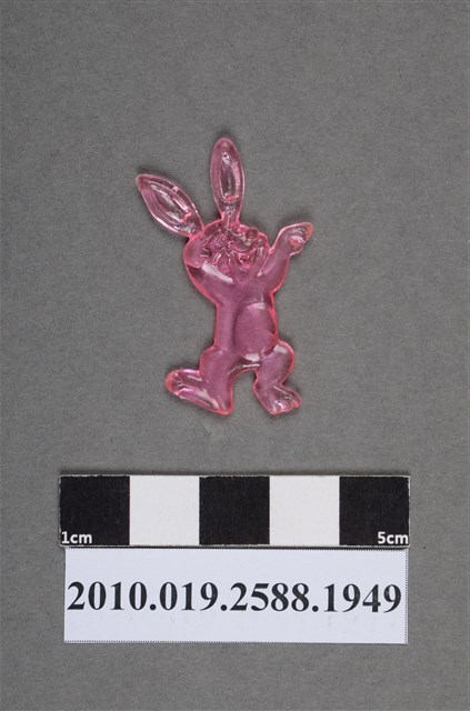 1.本物件為跳舞兔型尪仔仙。硬質塑膠材質,扁平,單一粉紅色,雙面浮雕圖案,兩面圖案相同。圖案為擬人化的兔子,耳朵高聳,張嘴,雙手舉起至頭,為站姿,一腳腳後跟抵地,呈跳舞之姿。